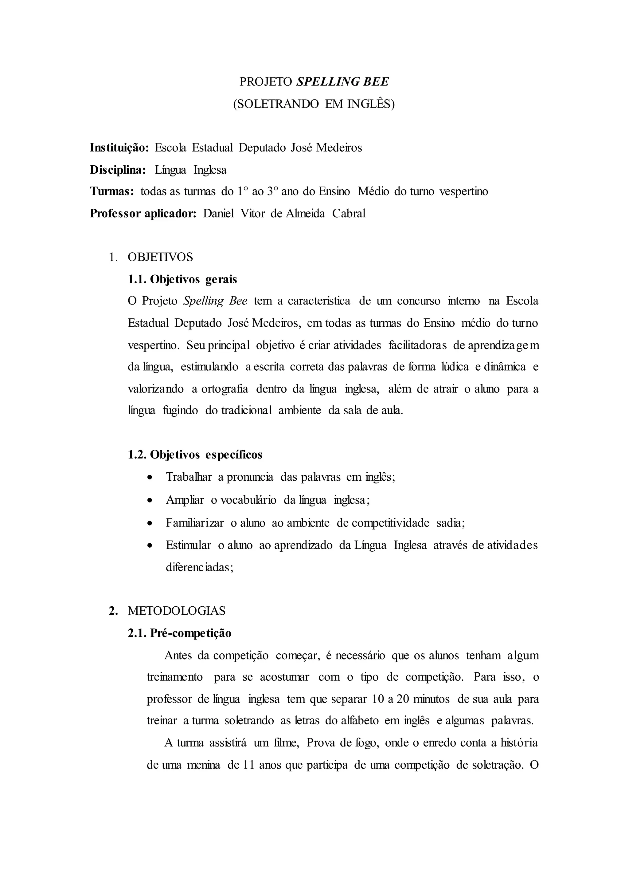 O projeto tem como objetivo principal criar atividades que estimulem o aprendizado da língua inglesa de forma lúdica, focando na ortografia correta das palavras. A competição acontecerá em três etapas: entre as salas de aula, entre as turmas e a final entre os melhores de cada turma. Os alunos serão avaliados em sua capacidade de soletrar palavras em inglês.