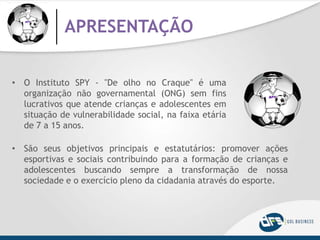 O Instituto SPY é uma ONG sem fins lucrativos que promove a inclusão social de crianças e adolescentes através do esporte. Seu projeto "Praticando Esporte, Semeando Valores" visa oferecer iniciação esportiva em futsal e tênis para 120 jovens, desenvolvendo seus valores morais e habilidades. O documento solicita patrocínios e investimentos para estruturar a escola esportiva.