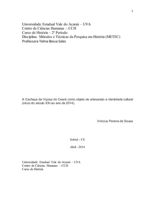 Este documento apresenta um projeto de pesquisa sobre a cachaça de Viçosa do Ceará como objeto de artesanato e identidade cultural entre o início do século XXI e 2014. O projeto visa analisar como a cachaça se desenvolveu na cidade e seu impacto cultural, usando fontes orais, visitas a engenhos e bares, e um festival anual. O objetivo geral é compreender os aspectos positivos e negativos da cachaça no contexto social e cultural local ao longo do tempo.