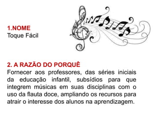 O projeto 'Toque Fácil' visa capacitar professores da educação infantil a integrar o uso da flauta doce nas aulas, tornando a aprendizagem mais atrativa para os alunos. O documento detalha uma metodologia passo a passo para ensinar a tocar flauta doce e sugere atividades em diversas disciplinas, como matemática e português. Ao final, espera-se que os professores consigam utilizar a flauta doce para motivar e engajar seus alunos nas aulas.