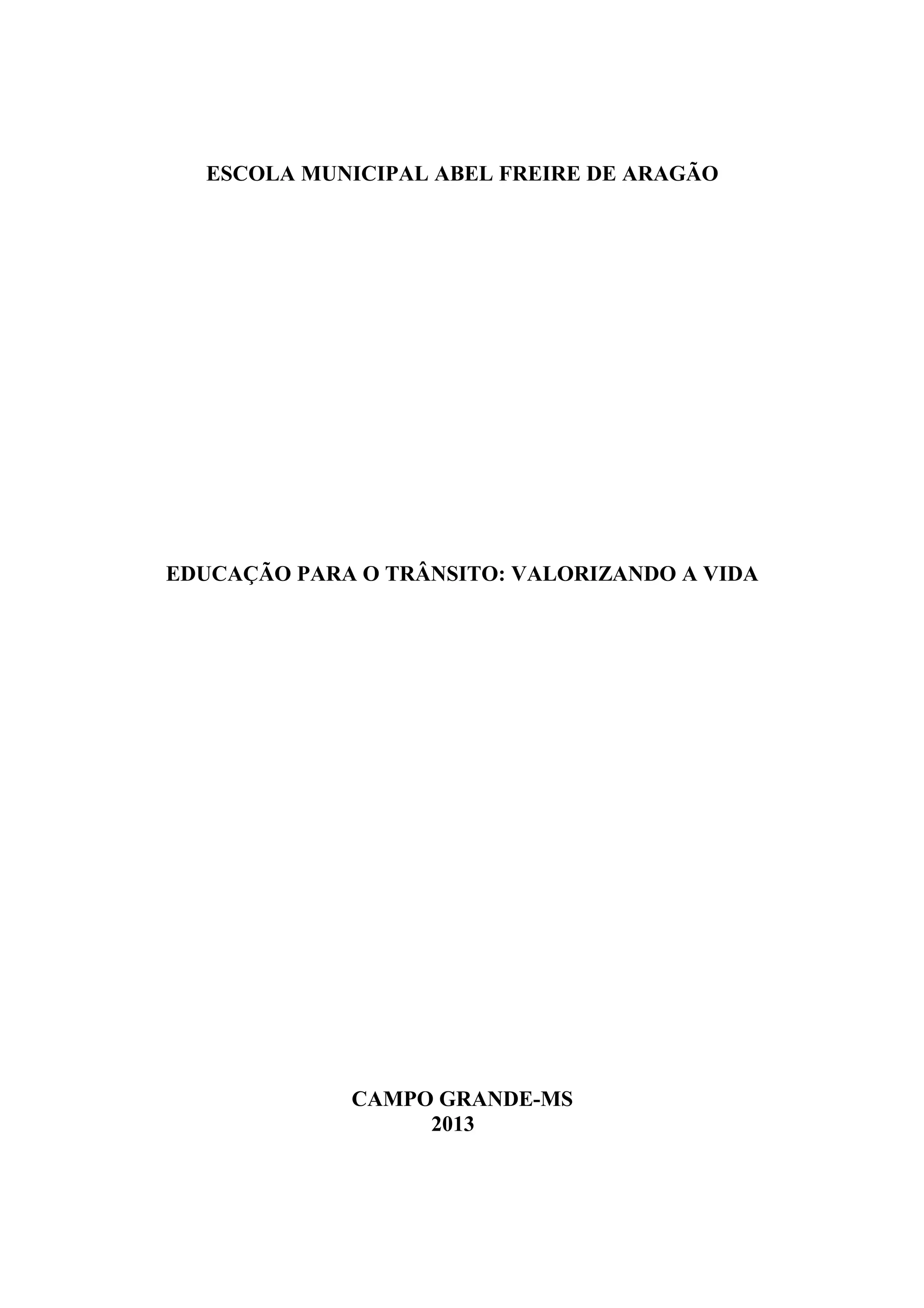 Este documento descreve um projeto de educação para o trânsito implementado na Escola Municipal Abel Freire de Aragão em 2013. O projeto envolveu alunos, professores, equipe técnica e pais através de atividades em sala de aula, palestras e produção de materiais para conscientizar sobre segurança no trânsito e respeito às leis. O objetivo era promover bons hábitos de circulação e reduzir acidentes.
