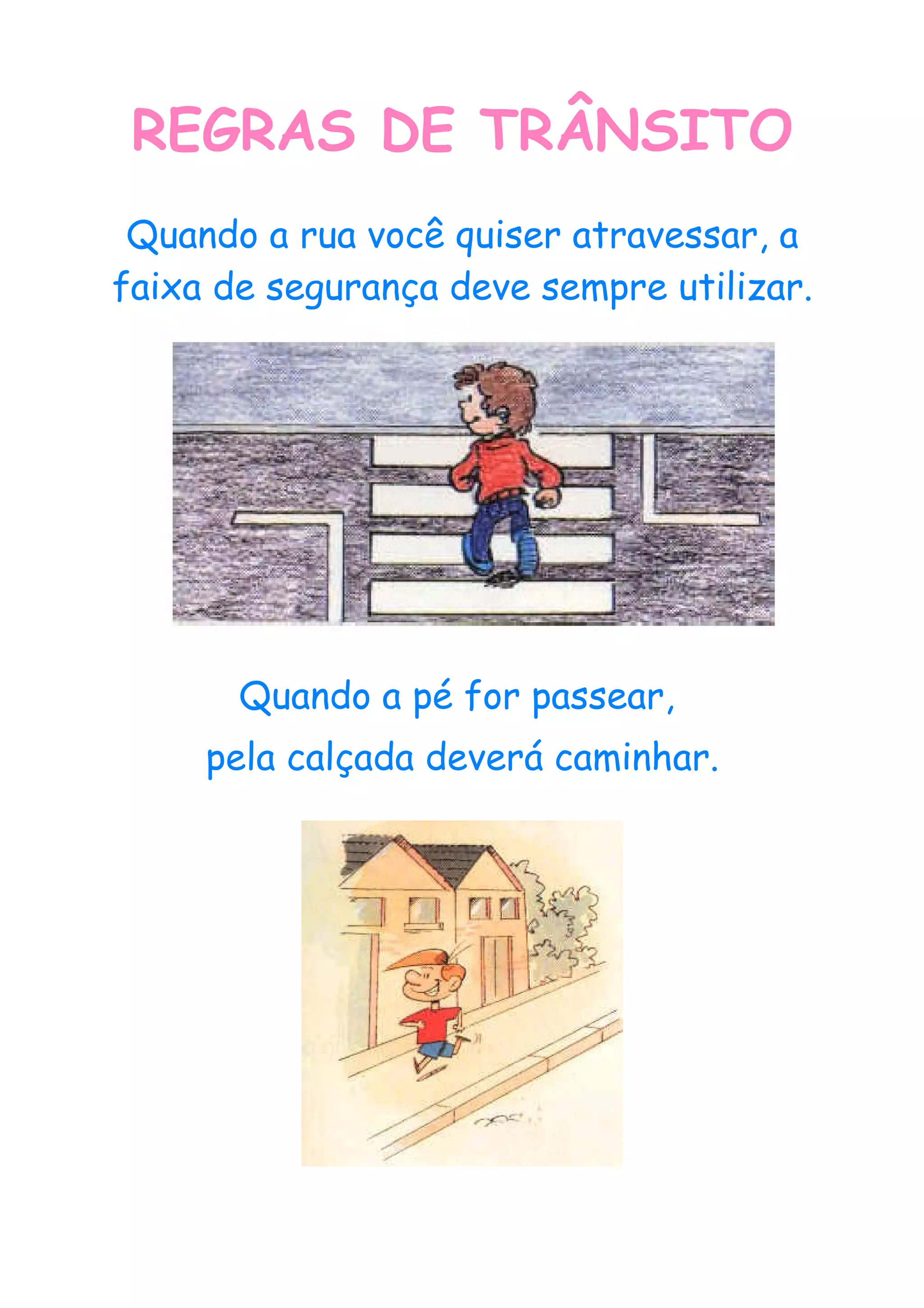 Este documento fornece regras de trânsito para pedestres e ciclistas, enfatizando a importância da segurança ao atravessar ruas, usar calçadas e cintos de segurança. Também descreve sinais de trânsito e suas funções.