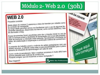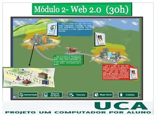 O documento descreve o projeto UCA, que tem como objetivo familiarizar o uso de ferramentas digitais como email, lista de discussão e blog para favorecer a formação de redes de cooperação. O curso terá 30 horas, sendo 12 presenciais e 18 a distância, e abordará o uso de email, vídeos, blogs e seus benefícios para a educação.