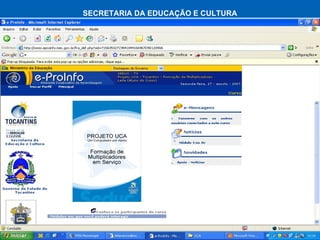 Este documento descreve o Projeto UCA (Universidade Corporativa Aberta) em Palmas, Tocantins no Brasil. O projeto começou em 2007 com 919 alunos e continuou em 2008 com 920 alunos do 2o ano do ensino fundamental até a 3a série do ensino médio. O projeto oferece oficinas para alunos, equipe gestora e técnicos, e forma parcerias com instituições de ensino superior e empresas de tecnologia.