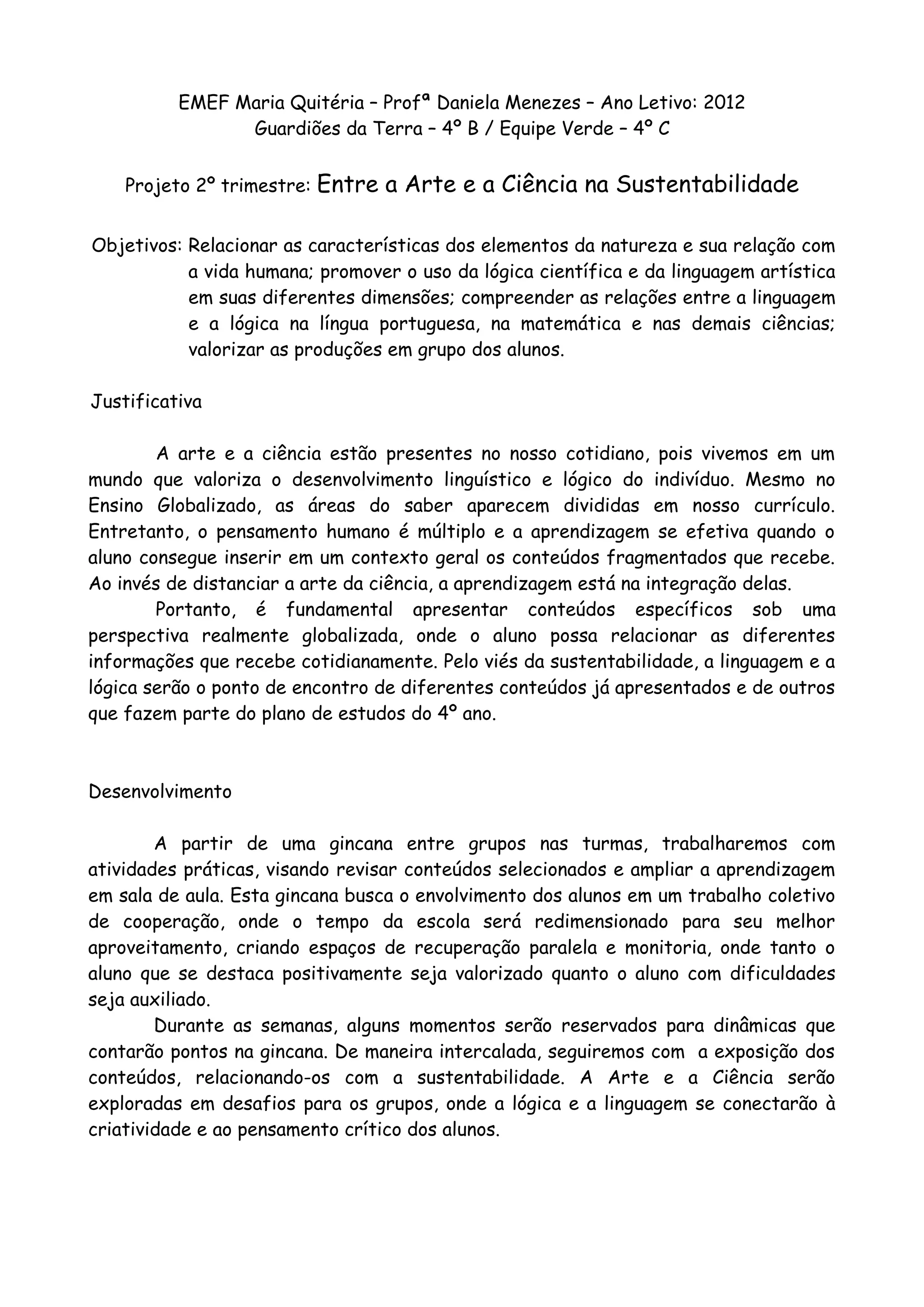Este documento apresenta o projeto do 2o trimestre da EMEF Maria Quitéria sobre a relação entre arte e ciência na sustentabilidade. O projeto tem como objetivos relacionar a natureza com a vida humana e integrar arte e ciência. Será desenvolvido por meio de atividades práticas e gincanas visando revisar conteúdos de forma transdisciplinar e estimular a cooperação entre os alunos. Abordará temas como matemática, português e meio ambiente de forma criativa e científica.
