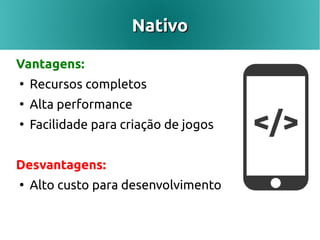 O documento discute os tipos de aplicações móveis, incluindo nativas, web móveis e híbridas. Aplicações nativas oferecem recursos completos e alta performance, mas têm alto custo de desenvolvimento, enquanto aplicações web móveis têm atualizações fáceis mas recursos limitados. Aplicações híbridas combinam os benefícios das duas abordagens. Exemplos de aplicações discutidas incluem WhatsApp, WolframAlpha e LinkedIn.