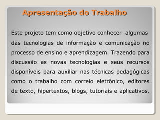Este projeto apresenta um plano de quatro aulas para ensinar estudantes do ensino médio sobre tecnologias da informação e comunicação. Os alunos farão pesquisas online, enviarão e-mails uns aos outros, editarão textos juntos, e compilarão seus trabalhos em um diário eletrônico para compartilhar online. O objetivo é ensinar habilidades digitais úteis enquanto se discute como as novas tecnologias podem apoiar técnicas pedagógicas.