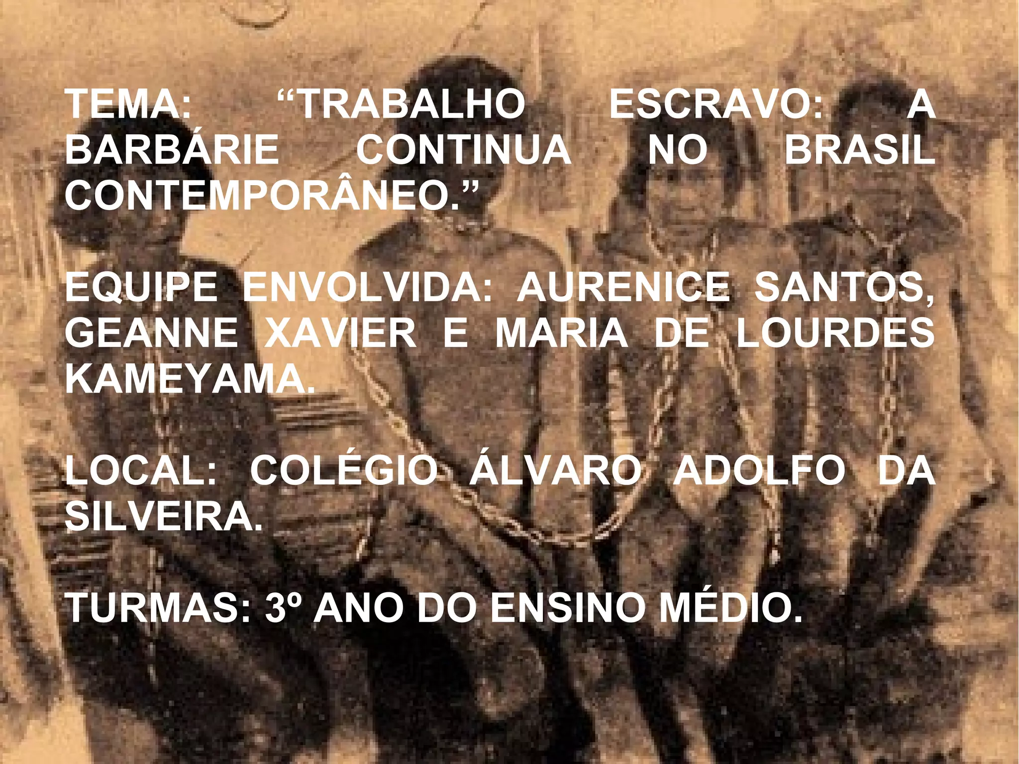 O documento descreve um projeto desenvolvido por três professoras para alunos do 3o ano do ensino médio sobre trabalho escravo no Brasil contemporâneo. O projeto tem como objetivo despertar a consciência crítica dos alunos sobre esta realidade através de pesquisas, produções textuais e debates. A metodologia inclui estudos sobre a escravidão histórica e pesquisas sobre casos atuais.