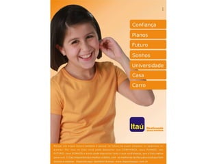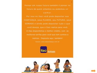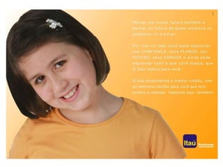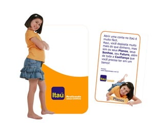 O documento apresenta o histórico de comunicação do Itaú, dados sobre seus clientes e mercados, uma pesquisa sobre hábitos financeiros e diagnóstico. A proposta de criação é "Não guarde seu dinheiro no cofrinho em casa. Deposite no Itaú. Aqui o cliente deposita o que ele quiser que o Itaú realiza." O tema é "Deposite seu sonho no Itaú" e a mídia proposta inclui TV, jornais e outdoor.