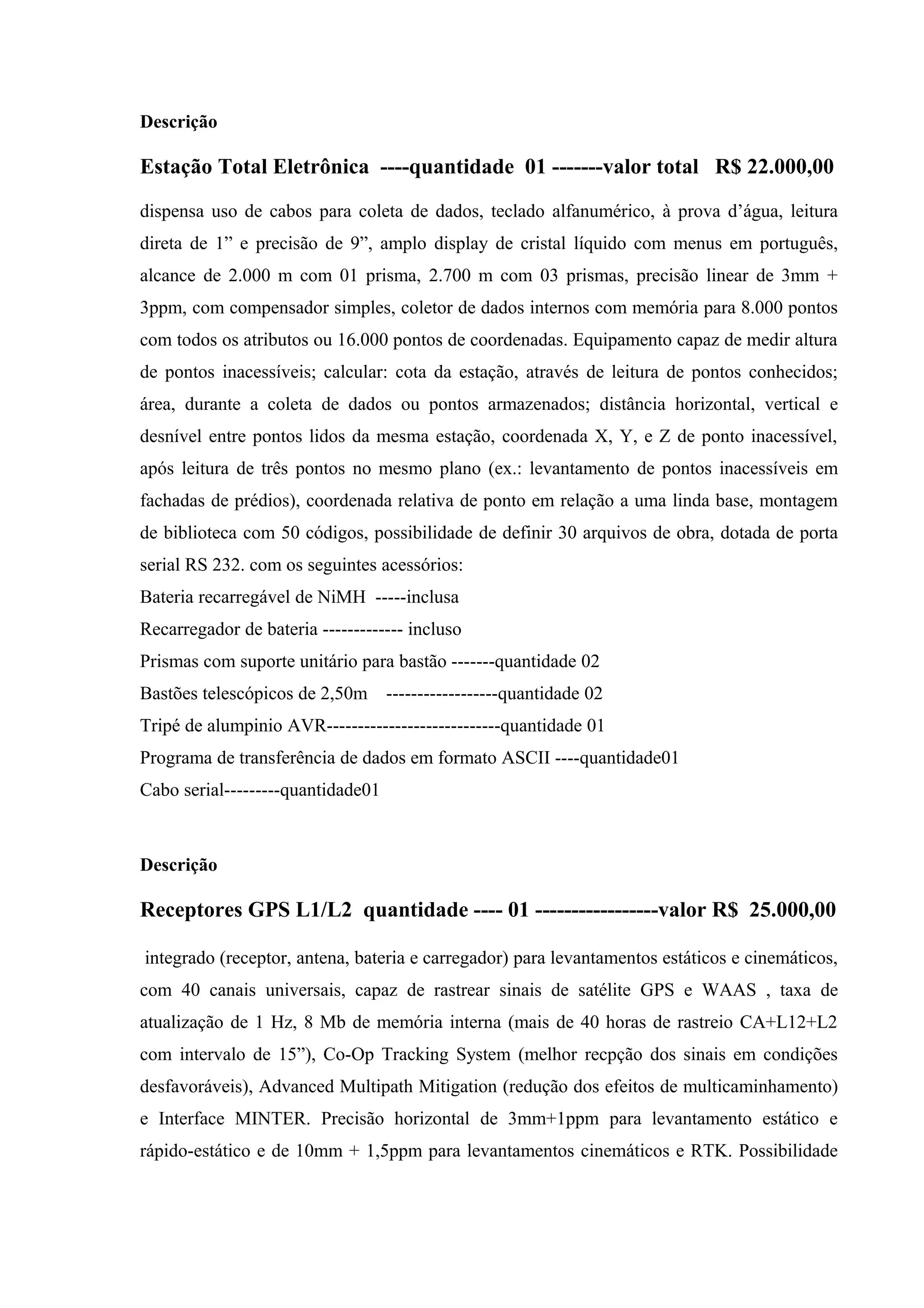 O documento descreve três itens de equipamentos de topografia: (1) uma estação total eletrônica no valor de R$22.000,00 capaz de medir distâncias de até 2.000m com precisão de 3mm + 3ppm, (2) um receptor GPS dual-frequência no valor de R$25.000,00 com precisão horizontal de 3mm+1ppm e (3) um coletor de dados topográficos com software no valor de R$11.000,00 com tela touchscreen e bateria com autonomia de 11 horas.