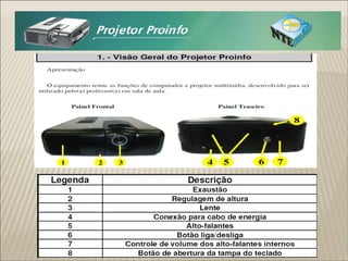 O documento fornece instruções sobre o uso do projetor Proinfo, desenvolvido para ser utilizado por professores em sala de aula. Explica como ligar e desligar o projetor, conectá-lo a notebooks, drives USB e redes sem fio, e fornece dicas de cuidados e manutenção.