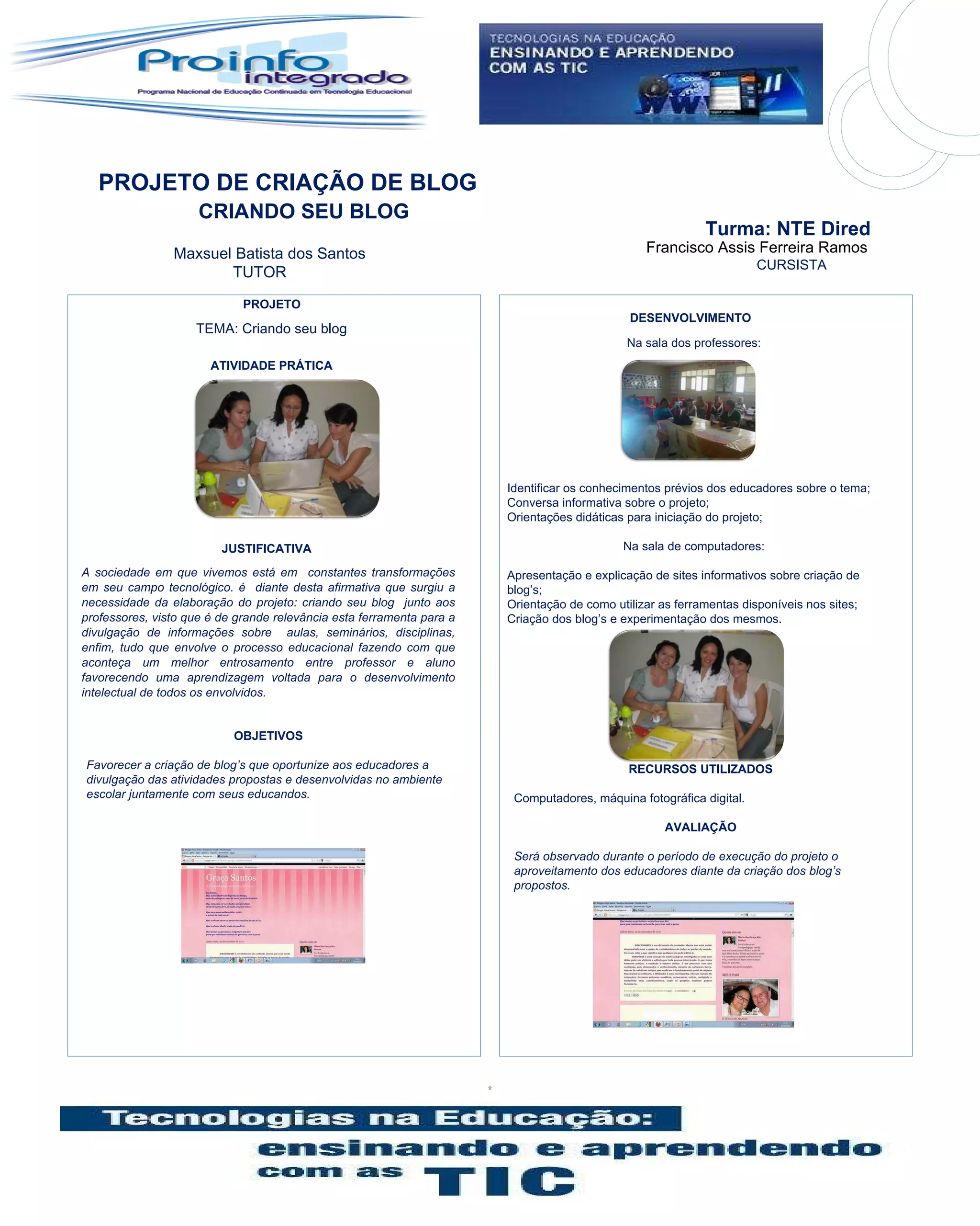 Este documento descreve um projeto para ensinar professores a criar blogs para divulgar informações sobre aulas, seminários e disciplinas para melhorar a comunicação com os alunos. O projeto inclui conversas informativas, orientações sobre como criar blogs e experimentação prática na criação de blogs pelos professores.