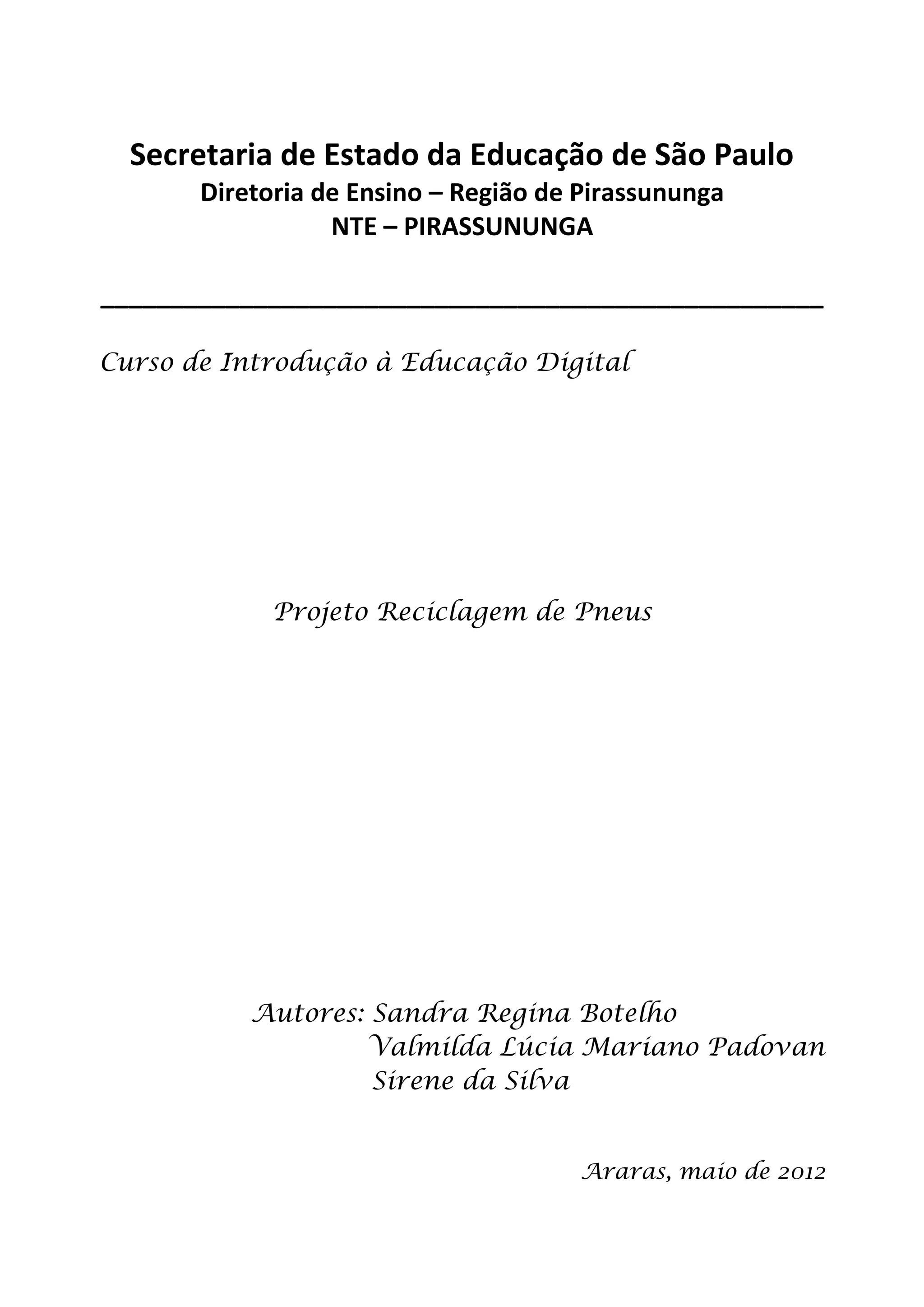 Este documento descreve um projeto de reciclagem de pneus usados em escolas da rede estadual de ensino de São Paulo. O projeto visa conscientizar estudantes e a comunidade sobre a importância da reciclagem e reutilização de pneus, que demoram séculos para se decompor na natureza e poluem o meio ambiente quando queimados. O projeto será implementado em três etapas: conscientização, coleta de pneus e confecção de puffs para uso nas escolas.