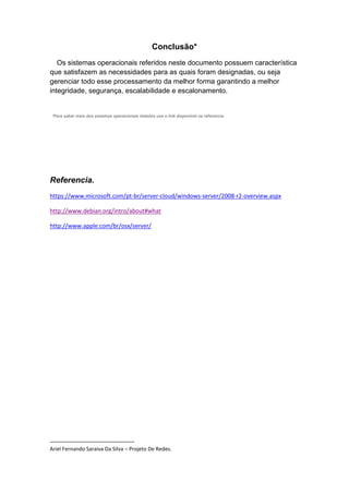 Este documento lista vários sistemas operacionais de servidores como Windows Server 2008 R2, Oracle Solaris OS, Red Hat Enterprise Linux e Debian Linux. Ele também fornece requisitos mínimos de hardware para alguns desses sistemas como Windows Server 2008 R2 (3GHz CPU, 2GB RAM, 80GB espaço em disco), Debian Linux (512MB RAM, 4GB espaço em disco) e Mac OSX Server (computador Mac com Mountain Lion, 2GB RAM, 10GB espaço em disco). Finalmente, conclui que esses sistemas operacionais são capazes de gerenc