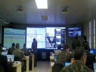 O documento descreve projetos de simulação e tecnologia do Exército Brasileiro, incluindo o primeiro simulador de helicópteros da América Latina (Projeto SHEFE) e um simulador de tiro de armas leves (Projeto STAL). Também discute oportunidades para empresas e universidades colaborarem em algoritmos, componentes de software e produção em escala.
