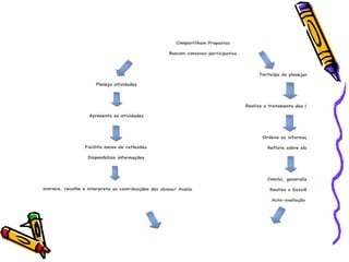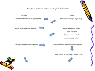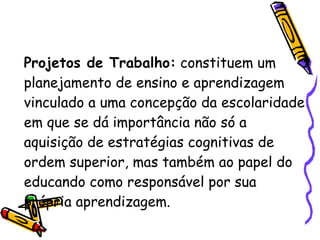 Projetos de Trabalho constituem um planejamento de ensino e aprendizagem que dá importância à aquisição de estratégias cognitivas e ao papel do aluno como responsável por sua própria aprendizagem. Projetos não são métodos, mas sim técnicas com passos estáveis que podem ser aplicadas em diferentes contextos. Projetos exigem a participação ativa dos alunos e percebem o conhecimento de forma significativa ao relacioná-lo com suas experiências.