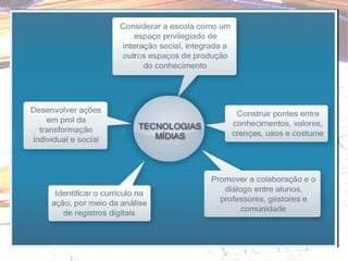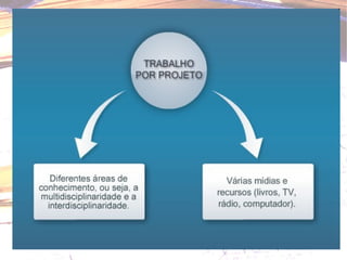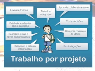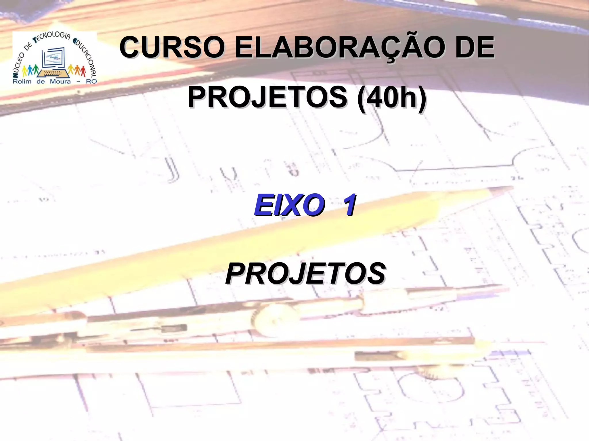 O documento apresenta os objetivos e estrutura de um curso sobre elaboração de projetos. O curso visa conceituar projetos e suas características, planejar projetos de sala de aula integrados com TIC e refletir sobre a aprendizagem. A estrutura inclui atividades presenciais e online com fóruns, leituras e elaboração de propostas de projetos. Também fornece detalhes sobre a estrutura de um projeto com tópicos como identificação, problema, objetivos e avaliação.