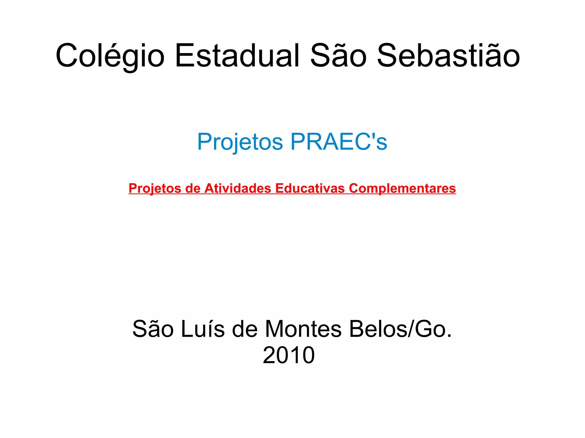 O documento descreve quatro projetos desenvolvidos no Colégio Estadual São Sebastião em 2010, incluindo o projeto "Espaço Cidadania Escola Aberta" que visa transformar a escola em um espaço comunitário de inclusão social, o projeto da "Banda Marcial" que busca valorizar a cultura local, o projeto "Abre Alas em São Luís" que também valoriza a cultura da região e o projeto de Vôlei que trabalha a iniciação no esporte.