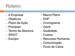 O documento descreve um projeto para capacitar recursos humanos para uma nova fábrica de calçados no Ceará. O objetivo é treinar 300 funcionários para iniciar as operações da fábrica. O projeto terá um orçamento inicial de R$ 385 mil e incluirá a criação de um centro de treinamento. O cronograma, equipe, riscos, comunicações e custos do projeto são detalhados.