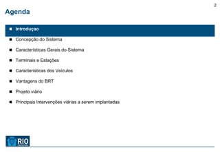 O documento descreve o projeto do sistema BRT Transoeste no Rio de Janeiro, que ligará Santa Cruz à Barra da Tijuca. O sistema terá 3 segmentos ao longo da Avenida das Américas e contará com 30 estações, além de terminais nos extremos. Serão realizadas grandes intervenções viárias para garantir faixas exclusivas aos ônibus articulados do BRT.