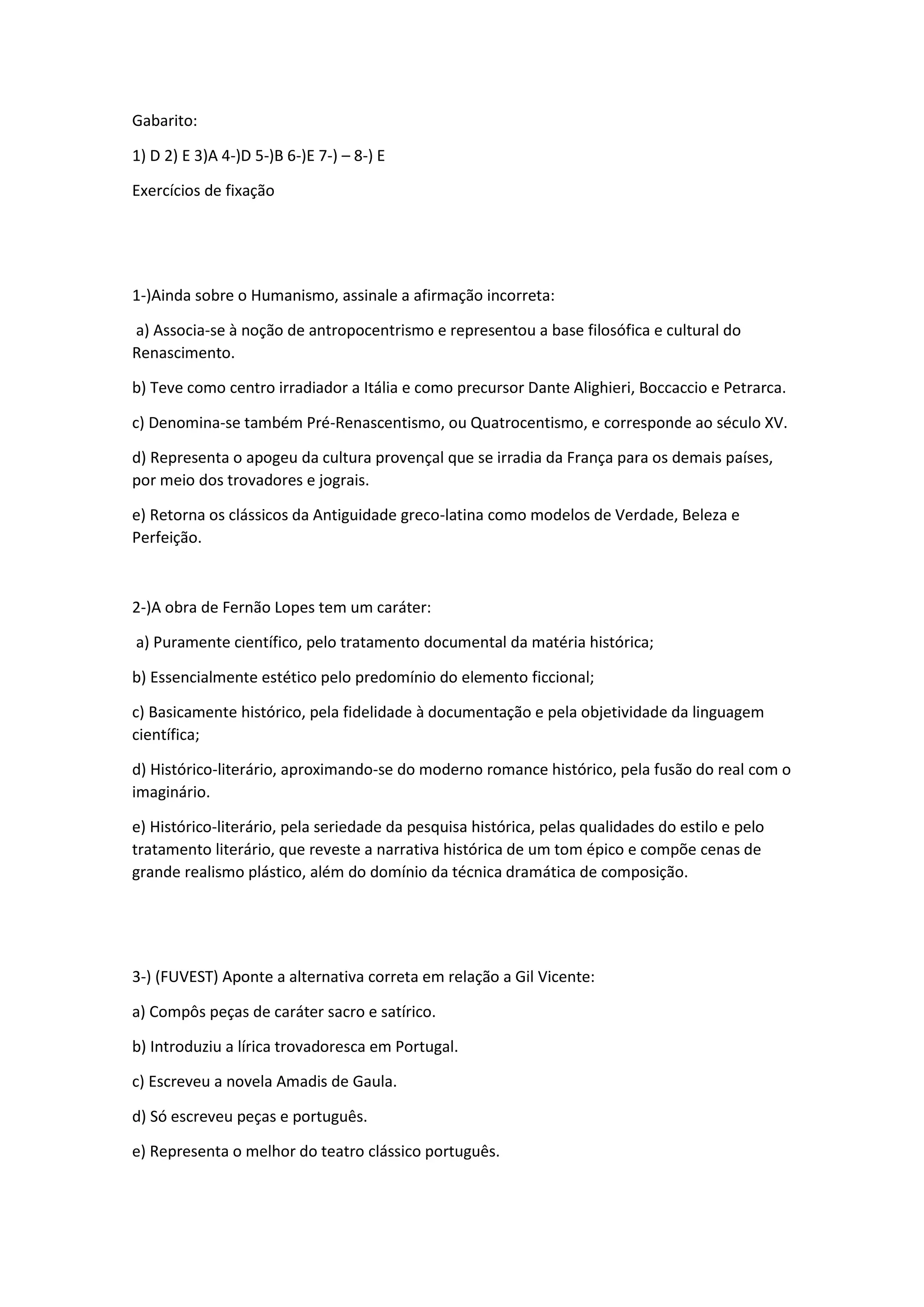 3) Aborda questões sobre a poesia trovadoresca, Gil Vicente e Fernão Lopes.