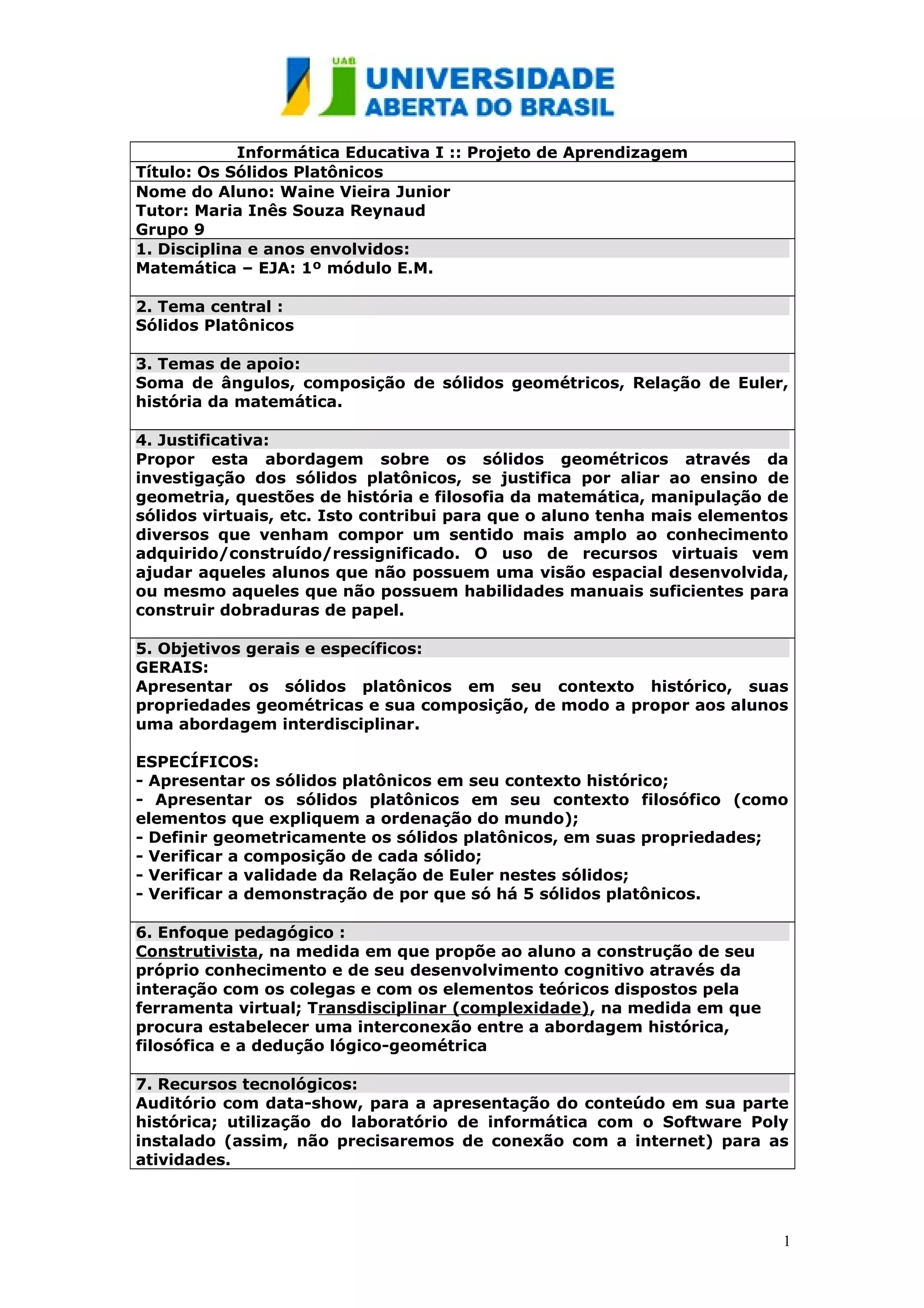 Este projeto apresenta os sólidos platônicos de forma interdisciplinar, abordando aspectos históricos, filosóficos e geométricos. Será realizado em duas etapas: na primeira, o professor apresentará o contexto histórico e filosófico dos sólidos e, na segunda, os alunos investigarão suas propriedades usando um software virtual. O objetivo é desenvolver a compreensão geométrica dos alunos de forma construtivista.