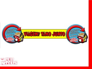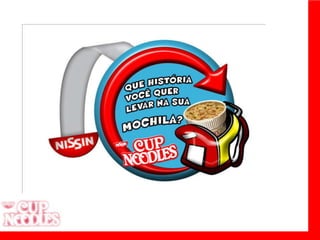 O documento discute uma ação promocional para o produto Cup Noodles da Nissin no PDV. Ele propõe um stand gigante no formato do produto com fumaça saindo do topo e degustação de sabores. Também recomenda posicionar o produto perto de massas, caixas e alimentos práticos. Detalha ainda uma ação de guerrilha, concurso com inscrição, julgamento, premiação e promoção do produto.