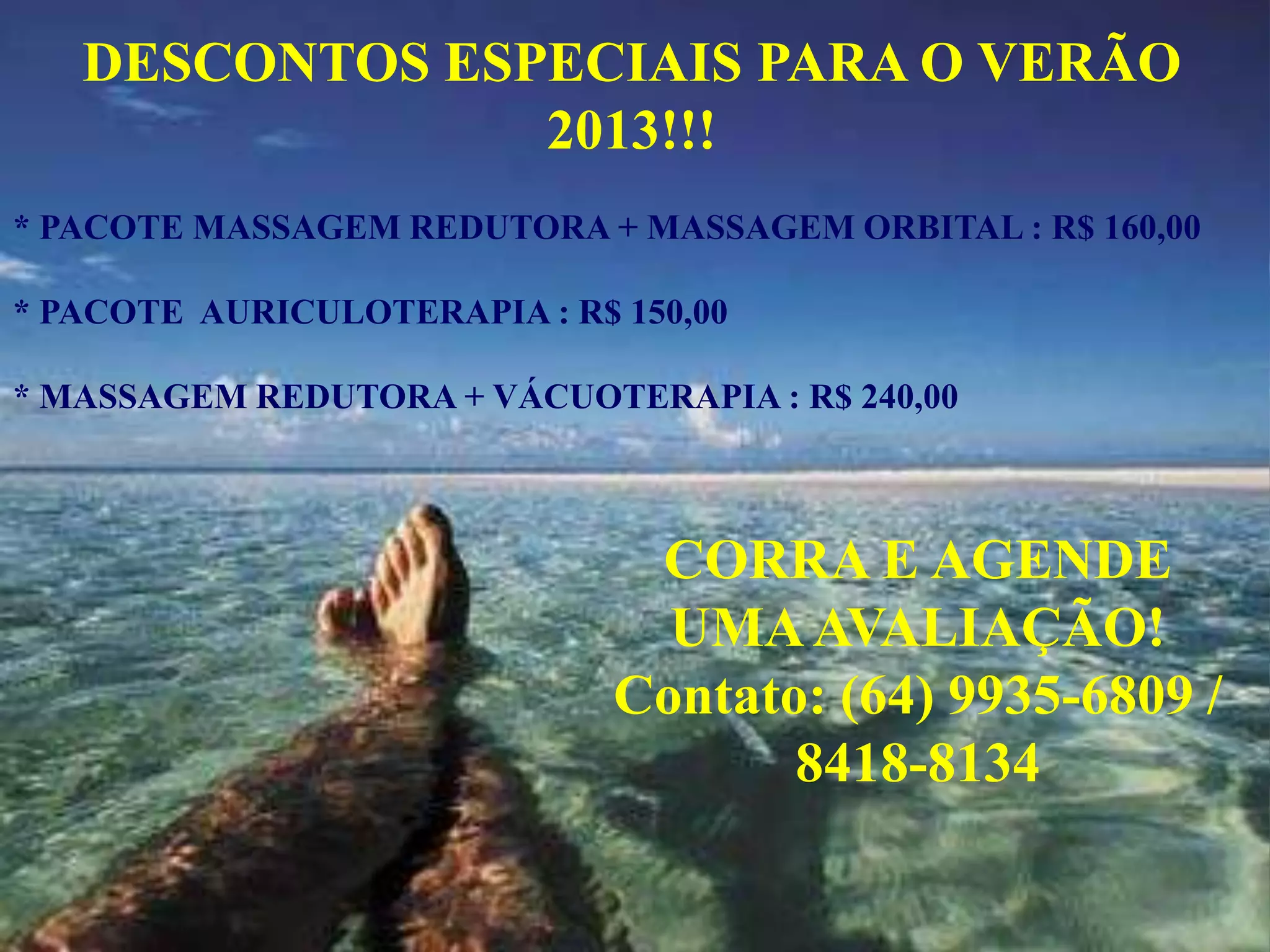 O documento oferece pacotes de tratamentos de beleza e bem-estar com descontos especiais para o verão de 2013, incluindo massagem redutora, auriculoterapia e vácuoterapia, e convida os leitores a agendarem uma avaliação com os contatos fornecidos.