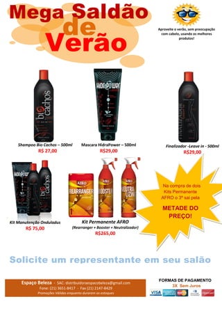 Uma distribuidora de produtos para cabelo está tendo um mega saldão de verão, oferecendo descontos em shampoos, máscaras e finalizadores, além de ofertas em kits de tratamento e permanente. Os clientes poderão parcelar as compras em 3 vezes sem juros.