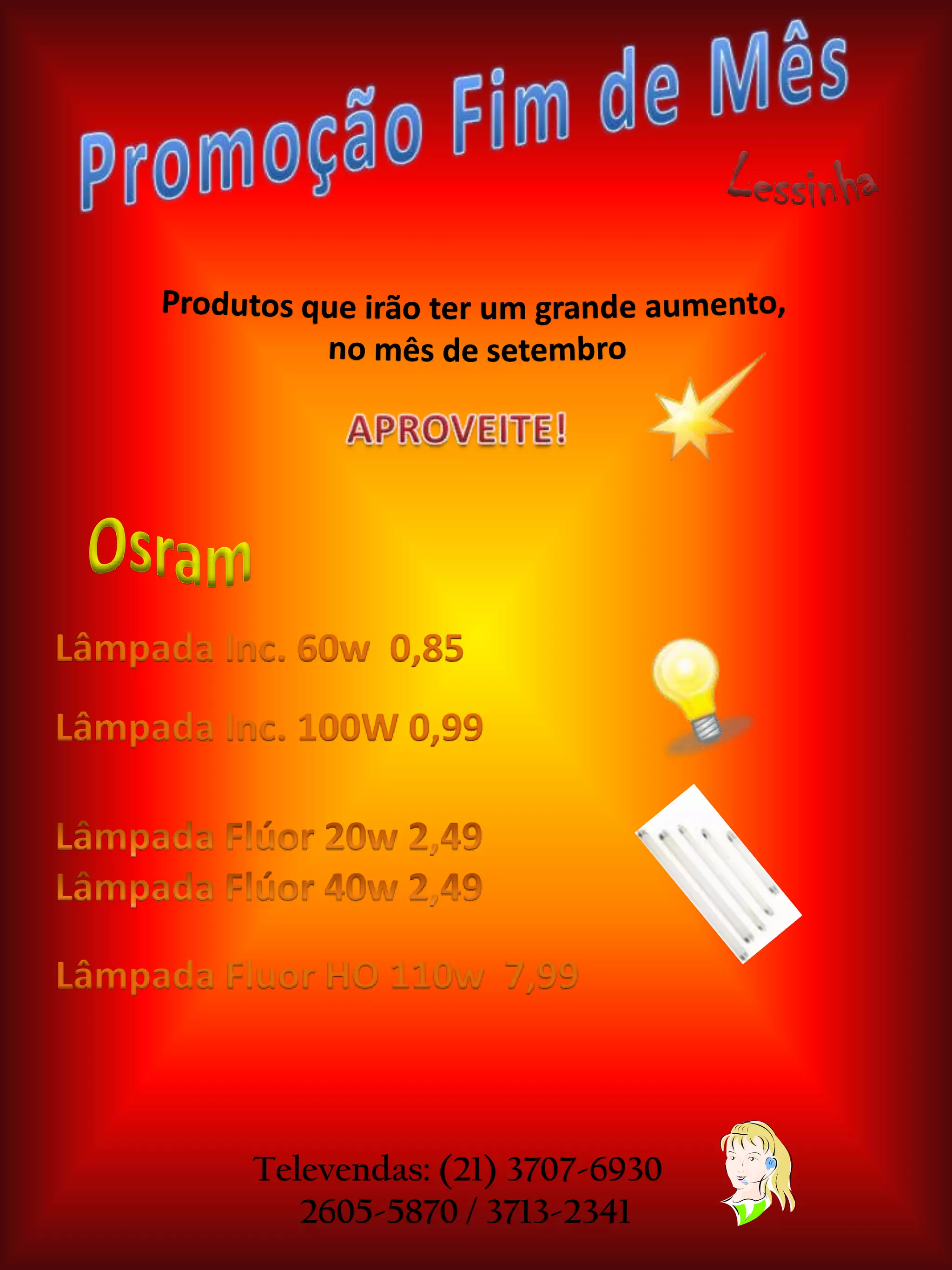 A lista de preços inclui lâmpadas de 60W por R$0,85, lâmpadas de 100W por R$0,99 e lâmpadas fluorescentes HO de 110W por R$7,99, com os números de telefone para pedidos.