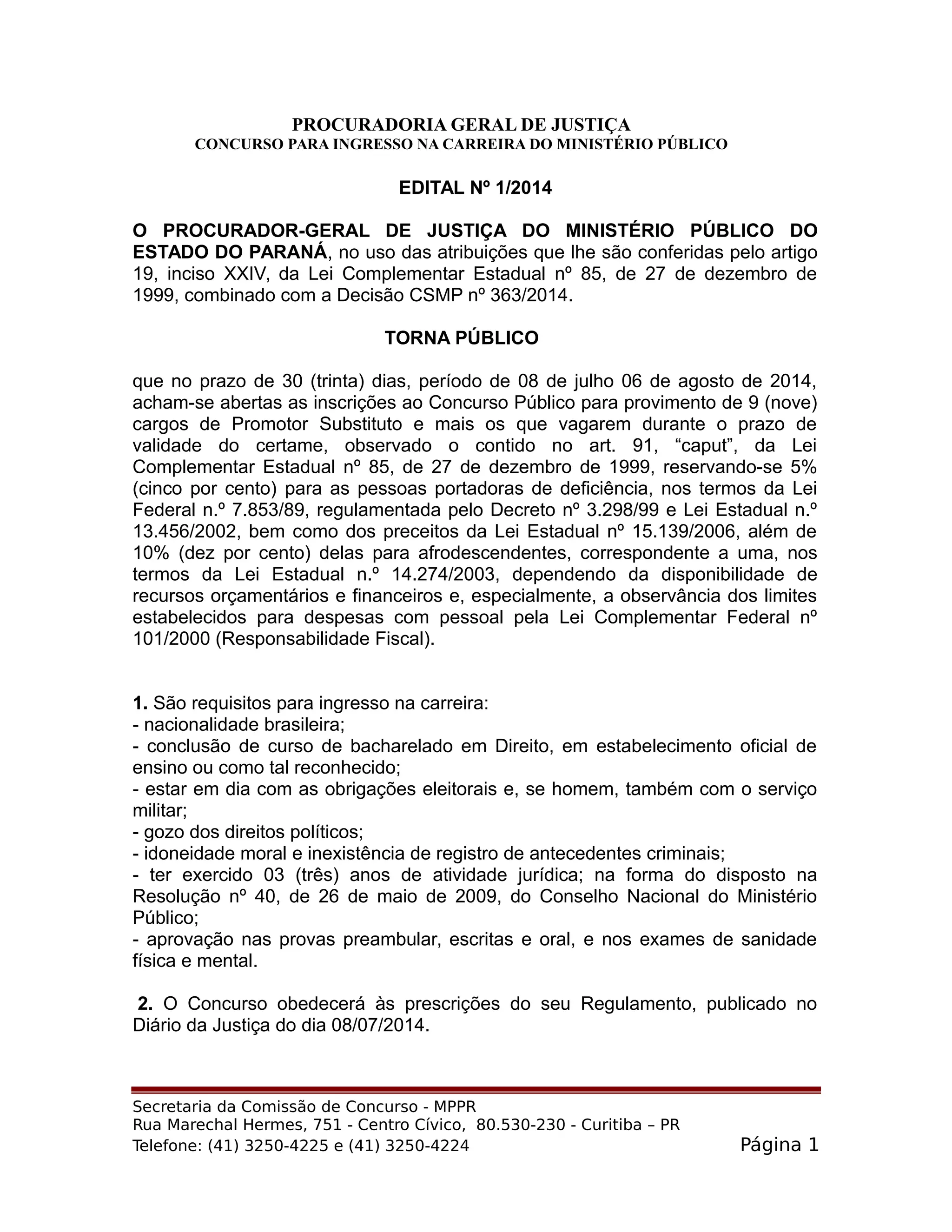 Este documento anuncia a abertura de inscrições para um concurso público para preenchimento de vagas de Promotor Substituto no Ministério Público do Estado do Paraná, com 9 vagas imediatas e mais as que possam surgir durante a validade do concurso. O documento detalha os requisitos para ingresso na carreira, o cronograma e etapas do concurso, incluindo prova preambular, provas escritas, exames médicos, prova oral e de títulos.