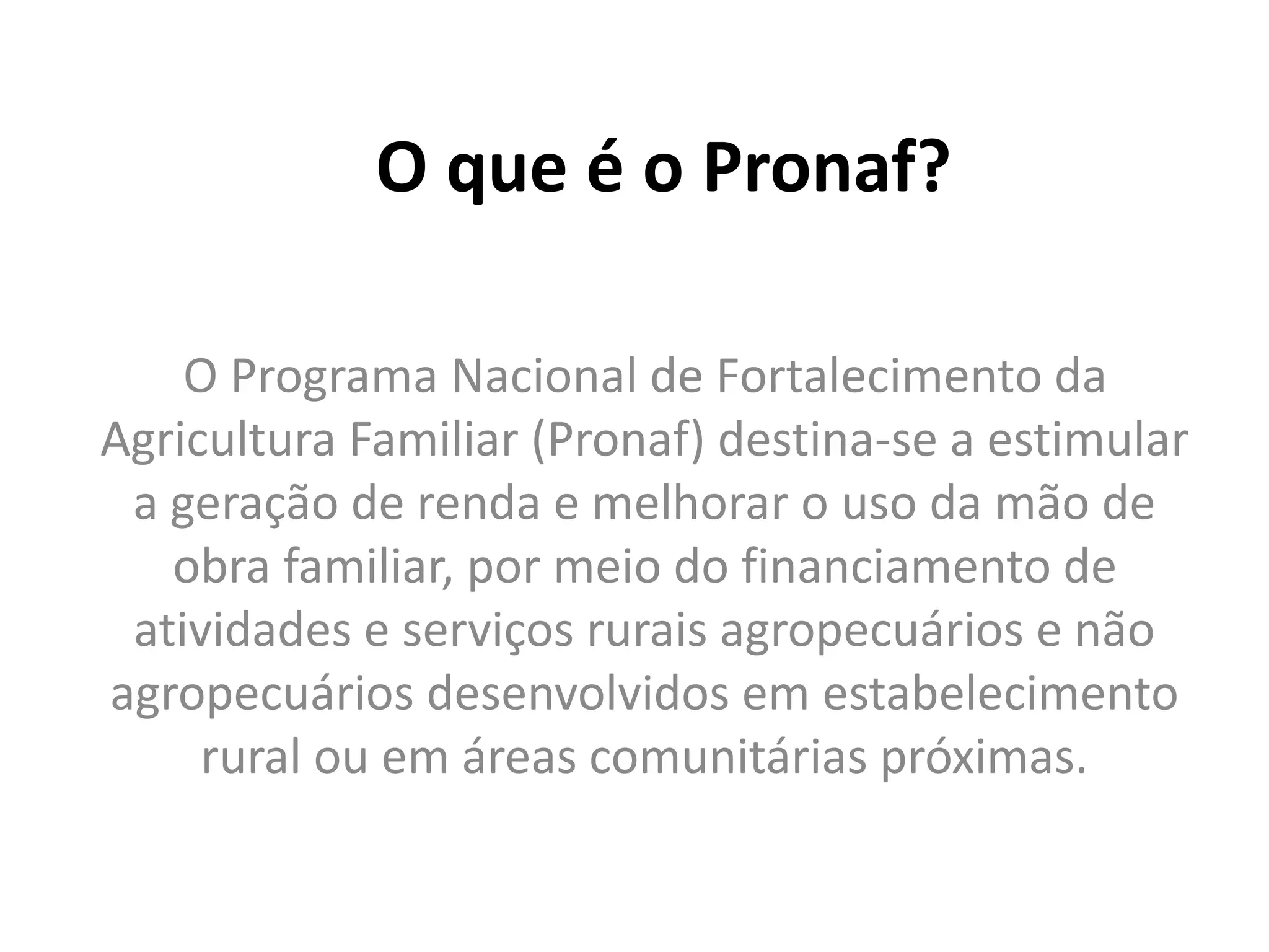O Pronaf destina-se a estimular a geração de renda e melhorar o uso da mão de obra familiar em atividades rurais por meio de financiamento. São beneficiários agricultores familiares assentados pela reforma agrária, que possuam renda familiar anual menor que R$20.000 ou R$360.000 dependendo dos critérios, e extrativistas, pescadores, aquicultores e silvicultores artesanais.