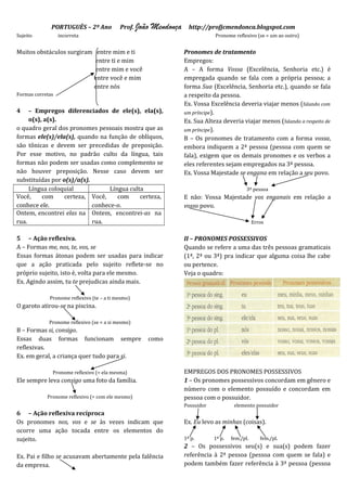 5 – Ação reflexiva. II – PRONOMES POSSESSIVOS