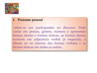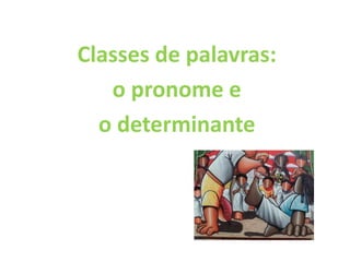 O documento descreve as classes gramaticais de pronomes e determinantes. Apresenta os tipos de pronomes pessoais, demonstrativos, possessivos, indefinidos e relativos e como variam em pessoa, gênero e número. Também explica os tipos de determinantes, incluindo artigos definidos e indefinidos, demonstrativos, possessivos, indefinidos, relativos e interrogativos.