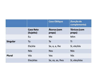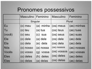 O documento discute diferentes tipos de pronomes: pronomes do caso reto e oblíquo, pronomes de tratamento como "vossa" e "sua", e pronomes possessivos como "minhas", "suas", "nossas". Explica como esses pronomes devem concordar com o elemento possuído e o possuidor.