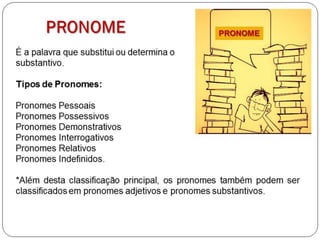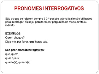 Este documento discute as funções gramaticais dos pronomes e suas formas. Ele explica que pronomes indicam pessoas no discurso, substituem palavras para promover coesão textual e indicam relações de posse. Também discute formas especiais de pronomes após certos verbos e o uso do pronome reflexivo.