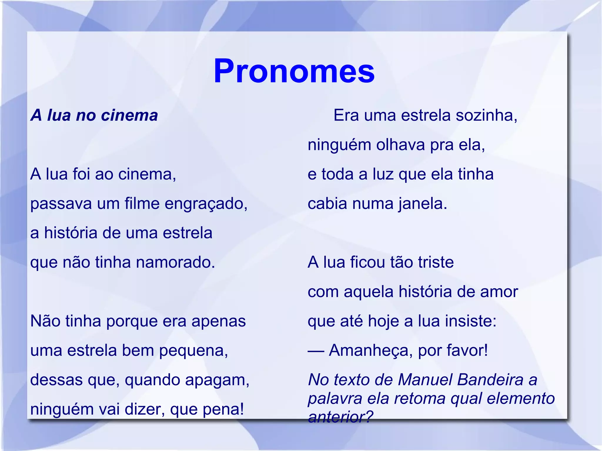 Em todo o estudo de pronomes, o aluno deve estar muito atento à seguinte