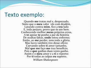 1) Pronomes demonstrativos indicam a localização de objetos no tempo, espaço ou texto em relação às pessoas do discurso; 2) Pronomes possessivos referem-se a algo que pertence a alguém; 3) Pronomes oblíquos átonos como "me", "te", "se" podem vir antes ou depois do verbo dependendo da estrutura da frase.