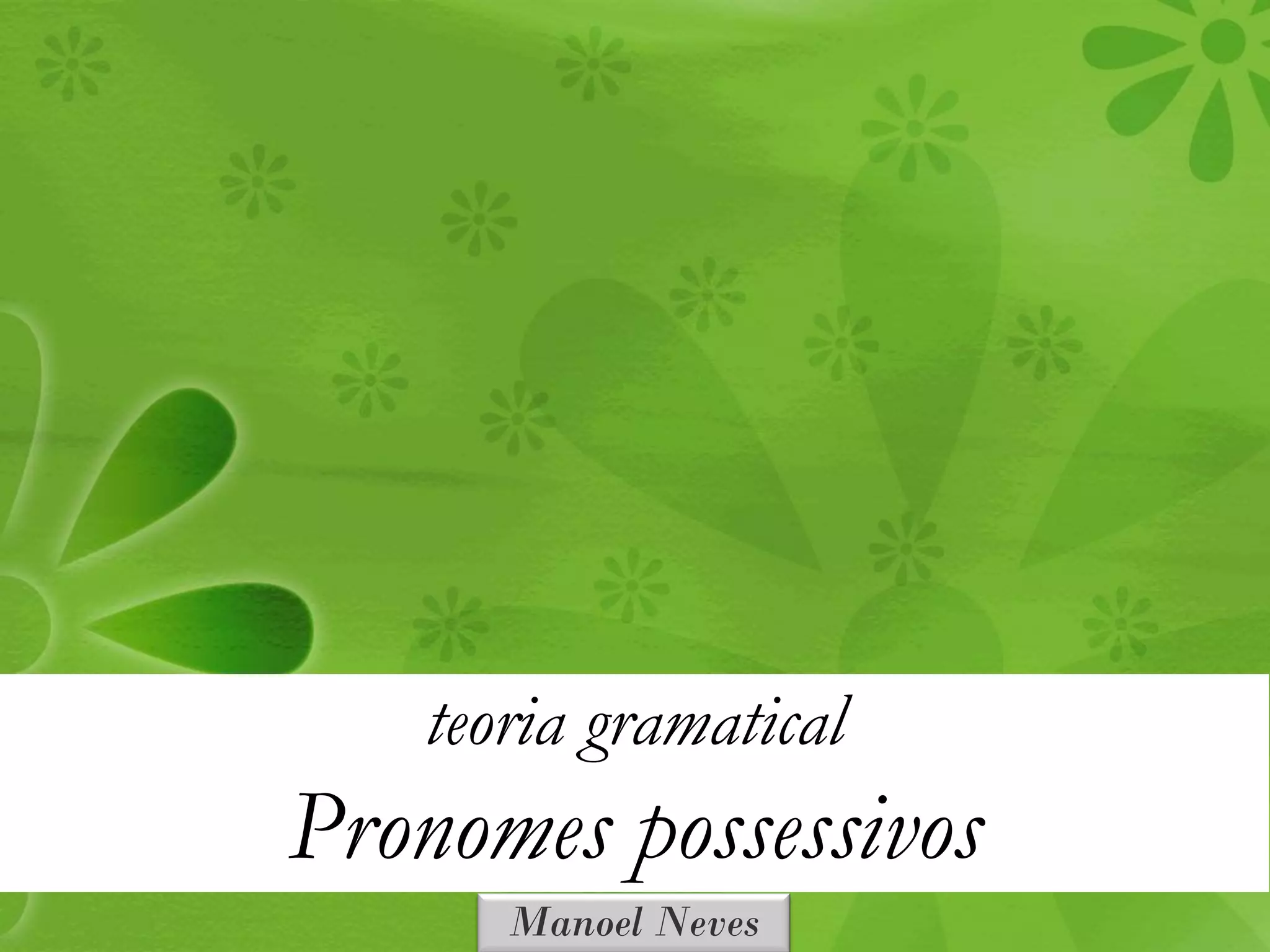 O documento discute pronomes possessivos em português. Apresenta suas definições e formas nas três pessoas do singular e plural, e discute casos em que pronomes oblíquos podem ter valor possessivo dependendo do contexto da frase. Exemplos ilustram a distinção entre uso oblíquo e possessivo.