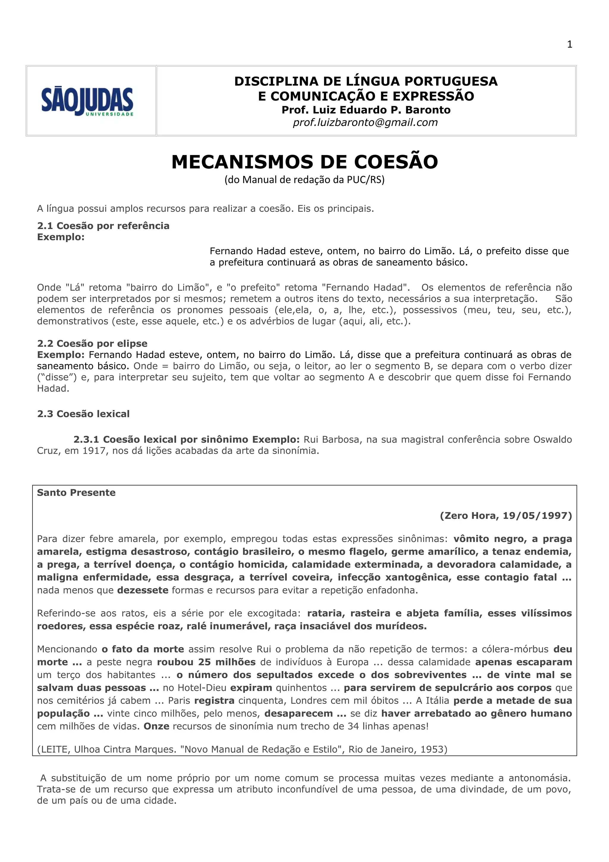 O documento descreve diferentes mecanismos de coesão em textos, incluindo coesão lexical por sinônimos, repetição e substituição, coesão por referência e elipse. Exemplos ilustram como esses recursos contribuem para a organização e coerência de um texto.