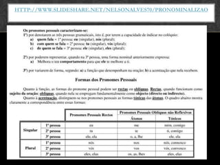 O documento discute diferentes tipos de pronomes em português, incluindo pronomes pessoais como eu, tu, se e com, e como eles são usados sintaticamente. Explica que eu e tu são usados como sujeito, enquanto mim e ti são usados como complemento, e que se, si e consigo são apenas usados na voz reflexiva. Também discute quando usar com nós/com vós e dele/de ele.