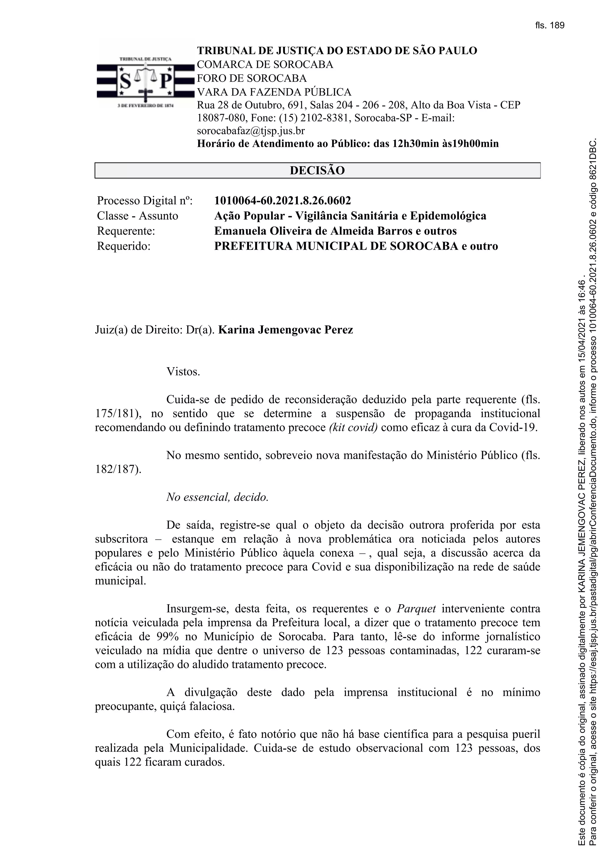 O tribunal decidiu que a prefeitura de Sorocaba deve se abster de veicular propaganda sobre a eficácia do tratamento precoce contra a Covid-19 sem comprovação científica. A prefeitura divulgou dados sobre 123 pessoas tratadas com 99% de eficácia, mas o tribunal considerou o estudo sem base científica. Uma multa de R$50.000 será aplicada em caso de descumprimento.