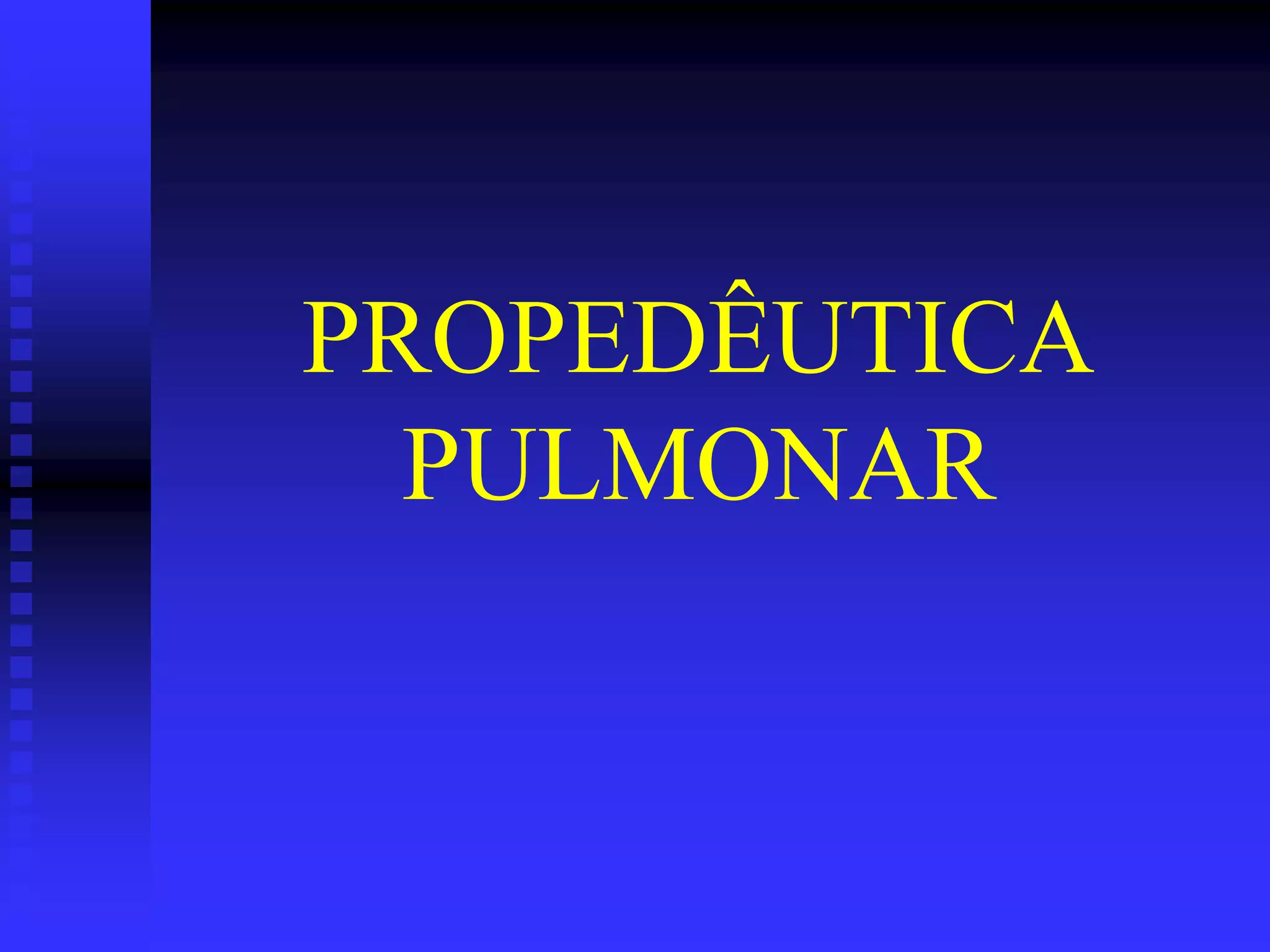 O documento descreve os principais pontos da propedêutica pulmonar, incluindo a inspeção estática e dinâmica do tórax, palpação, percusão e ausculta pulmonar. Detalha as divisões anatômicas do tórax, alterações morfológicas, tipos respiratórios, frêmitos, sons pulmonares na percusão e ruídos adventícios auscultados.