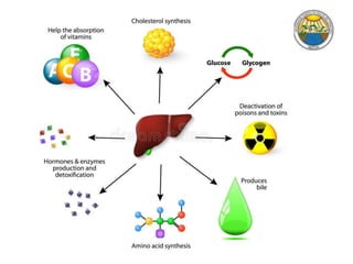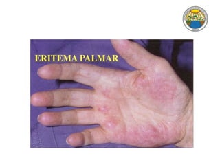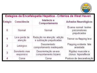[1] O documento discute a insuficiência hepática, incluindo suas funções, classificação, sinais e sintomas, alterações metabólicas, cutâneas, hematológicas e neurológicas. [2] Aborda as síndromes associadas como hepatocirculatória, hepatopulmonar e hepatorenal, bem como a encefalopatia hepática e seus fatores precipitantes. [3] O objetivo é revisar a propedêutica da insuficiência hepática.