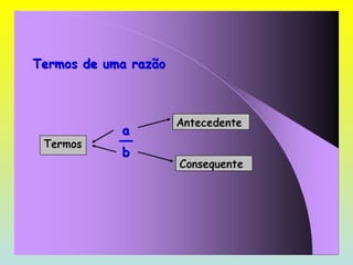 O documento discute razões, proporções e escalas. Explica que uma razão é a divisão entre duas grandezas e que uma proporção existe quando duas razões são iguais. Também define escala como a razão entre as medidas de um desenho e as correspondentes na realidade.