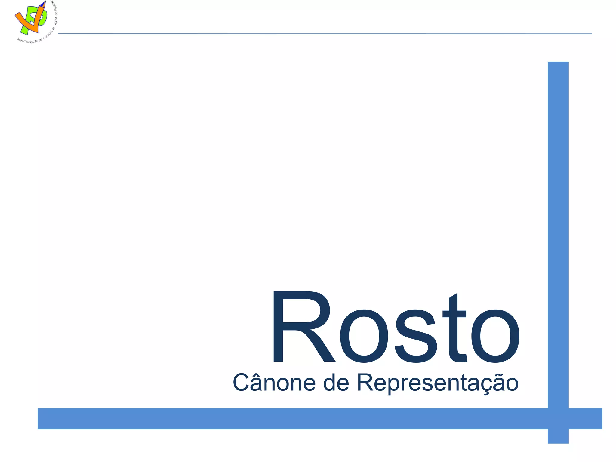 O documento descreve o cânone de representação do rosto, que ajuda a desenhar o rosto com proporções corretas. Explica que a cabeça mede 3,5 vezes a testa e fornece instruções para desenhar o esqueleto do rosto com linhas horizontais e verticais com base na medida da testa. Também fornece detalhes sobre como desenhar os olhos, nariz e boca dentro desse esqueleto.