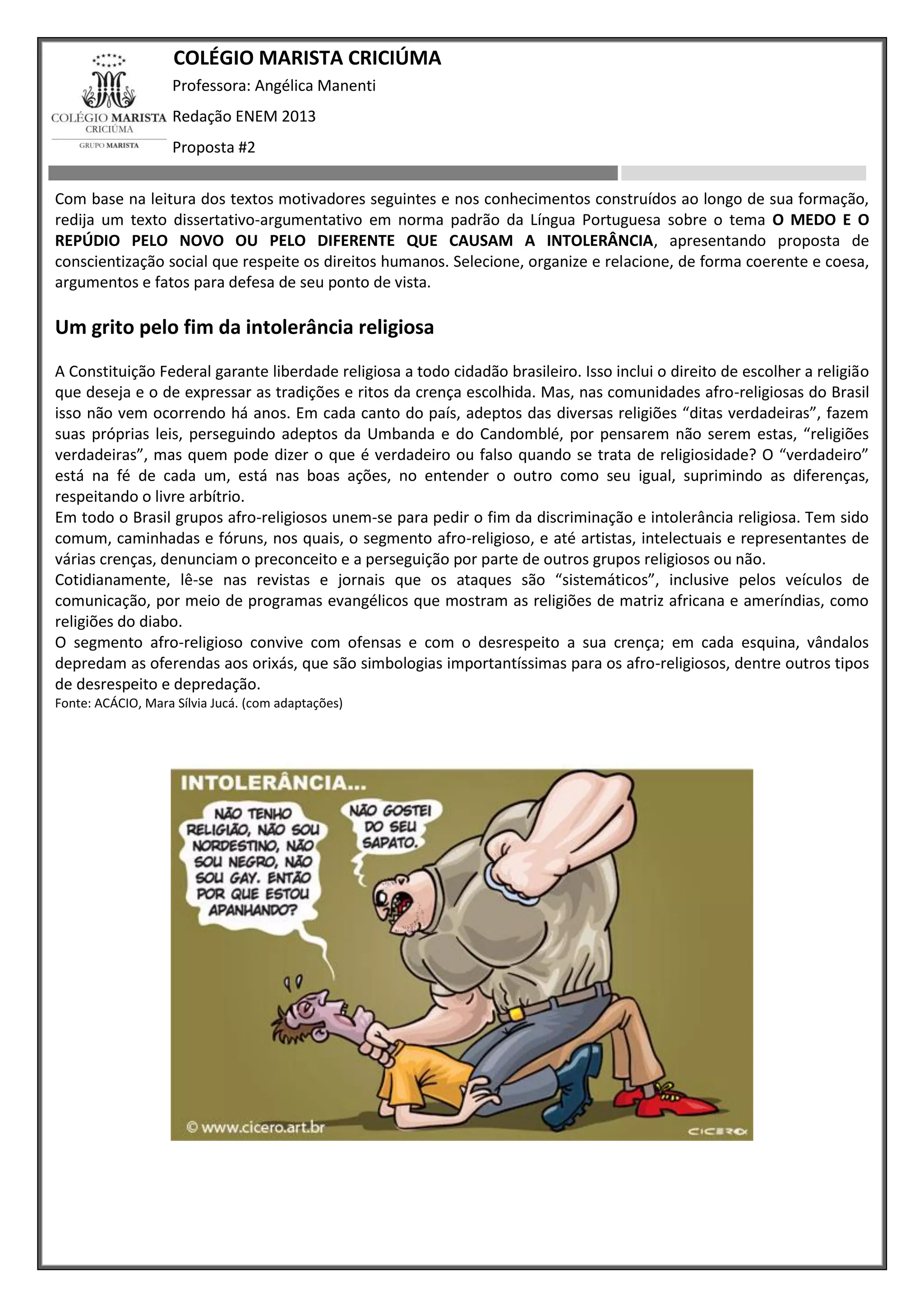 O documento propõe uma redação sobre a intolerância causada pelo medo do novo ou diferente, defendendo a conscientização social e respeito aos direitos humanos. Apresenta dois textos motivadores sobre a intolerância religiosa contra as religiões de matriz africana e a violência homofóbica no Brasil que matou mais de 3 mil homossexuais desde 1980.