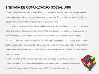 O documento descreve o logotipo e slogan para a Semana de Comunicação da UFRN. O logotipo é um cubo mágico em diversas cores que representa as várias áreas da comunicação social e a diversidade dos estudantes. O slogan é "Encontro de quem sabe o que diz", indicando que o evento trará palestrantes e participantes esclarecidos e de alto nível profissional.