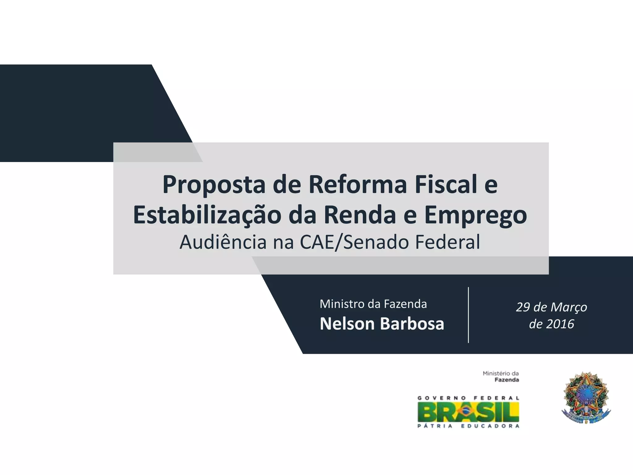 O documento apresenta uma proposta de reforma fiscal e estabilização da renda e emprego no Brasil. Ele discute a necessidade de medidas de ajuste fiscal de curto prazo combinadas com reformas estruturais de longo prazo para controlar o crescimento dos gastos públicos. A proposta inclui uma renegociação da dívida dos estados e medidas como um limite para o crescimento dos gastos e a criação de um depósito voluntário remunerado no Banco Central.