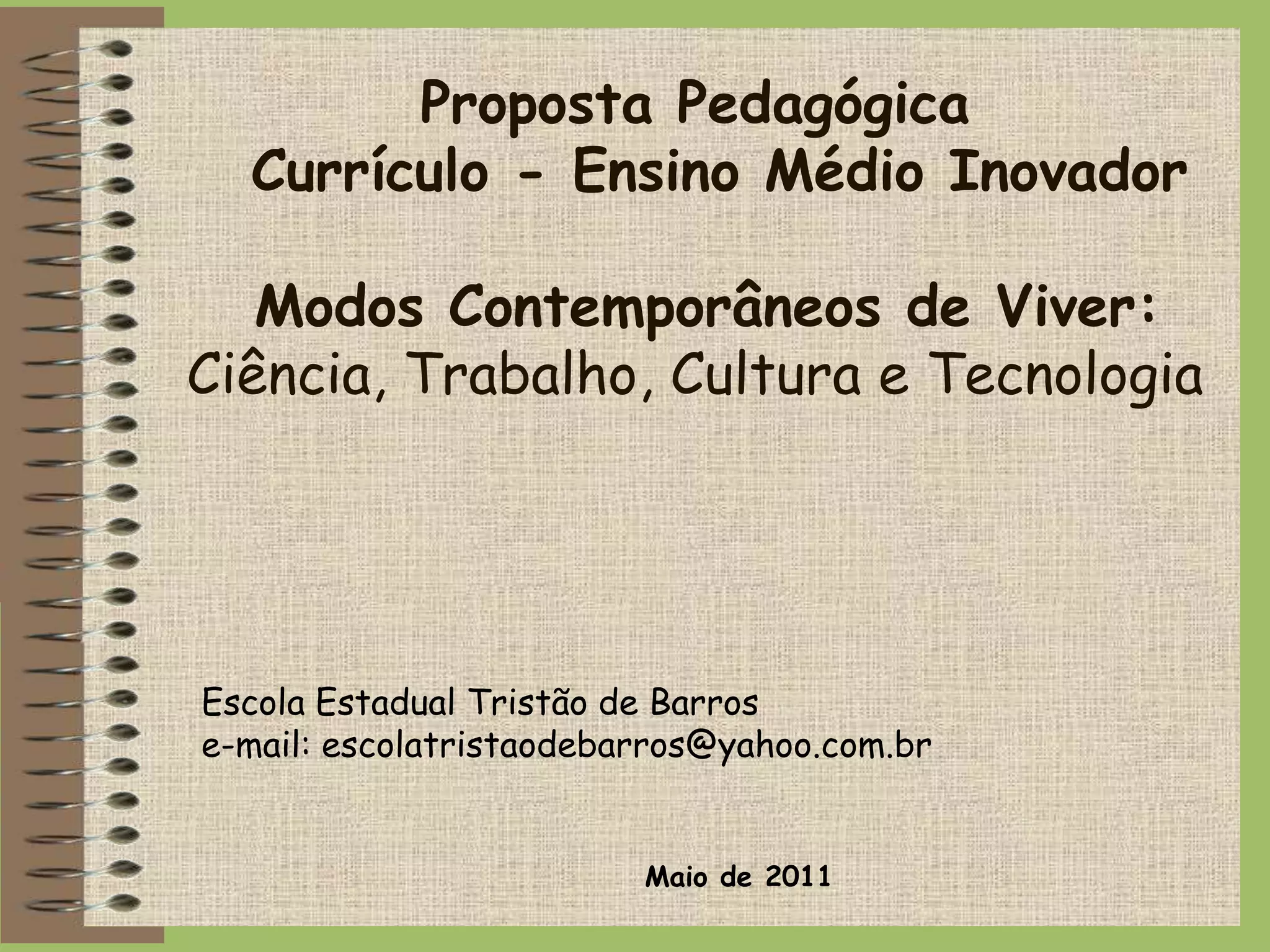 O documento propõe um currículo inovador para o ensino médio focado em temas contemporâneos como ciência, trabalho e tecnologia. A proposta visa promover aprendizagem ativa e autônoma dos alunos por meio de projetos interdisciplinares e atividades práticas como laboratórios, pesquisas e visitas de estudo. A avaliação será qualitativa e baseada na análise das produções dos alunos.